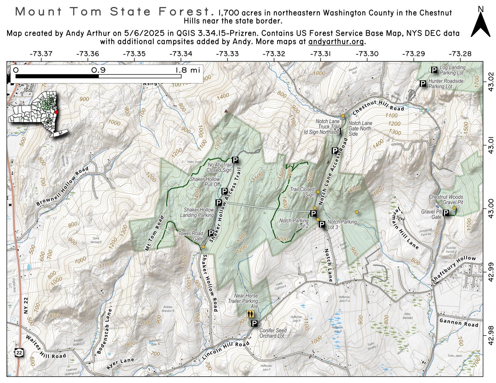 Hi. Thanks for posting the map of Mount Tom State Forest trails near Hoosick, NY. Iβm planning a bikepacking trip for next week and planning on primitive camping there. I understand there are no formal primitive sites. Are you aware of any places that might be well suited for primitive camping? My current plan is to go up Shaker Hollow Road and look in that flattish area to the west of the road.