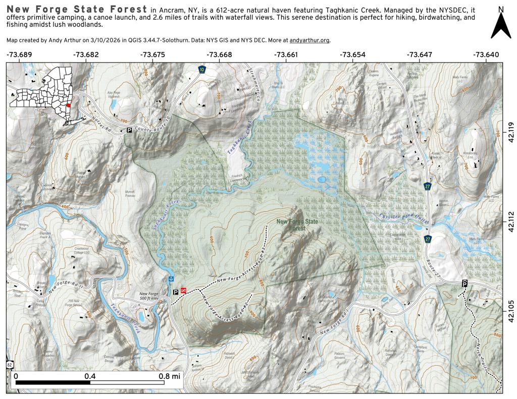 New Forge State Forest 612 acres in Tagkanic and is located along the Taghkanic Creek in Tagkanic. There is a red blazed trail over New Forge Hill. There is a boat launch aolong the creek and a gated access road you can follow along the wetlands in the creek.