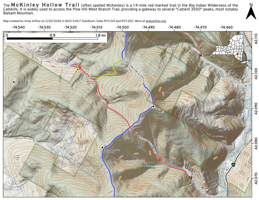 The Oliverea-Mapledale trail runs 3 1/4 miles from McKinley Hollow Road to Rider Hollow Road in Mapledale. There is a 1,400 foot climb to the col from the east, and roughly 1,000 feet down the otherside. Two lean-tos exist on way up to the col.