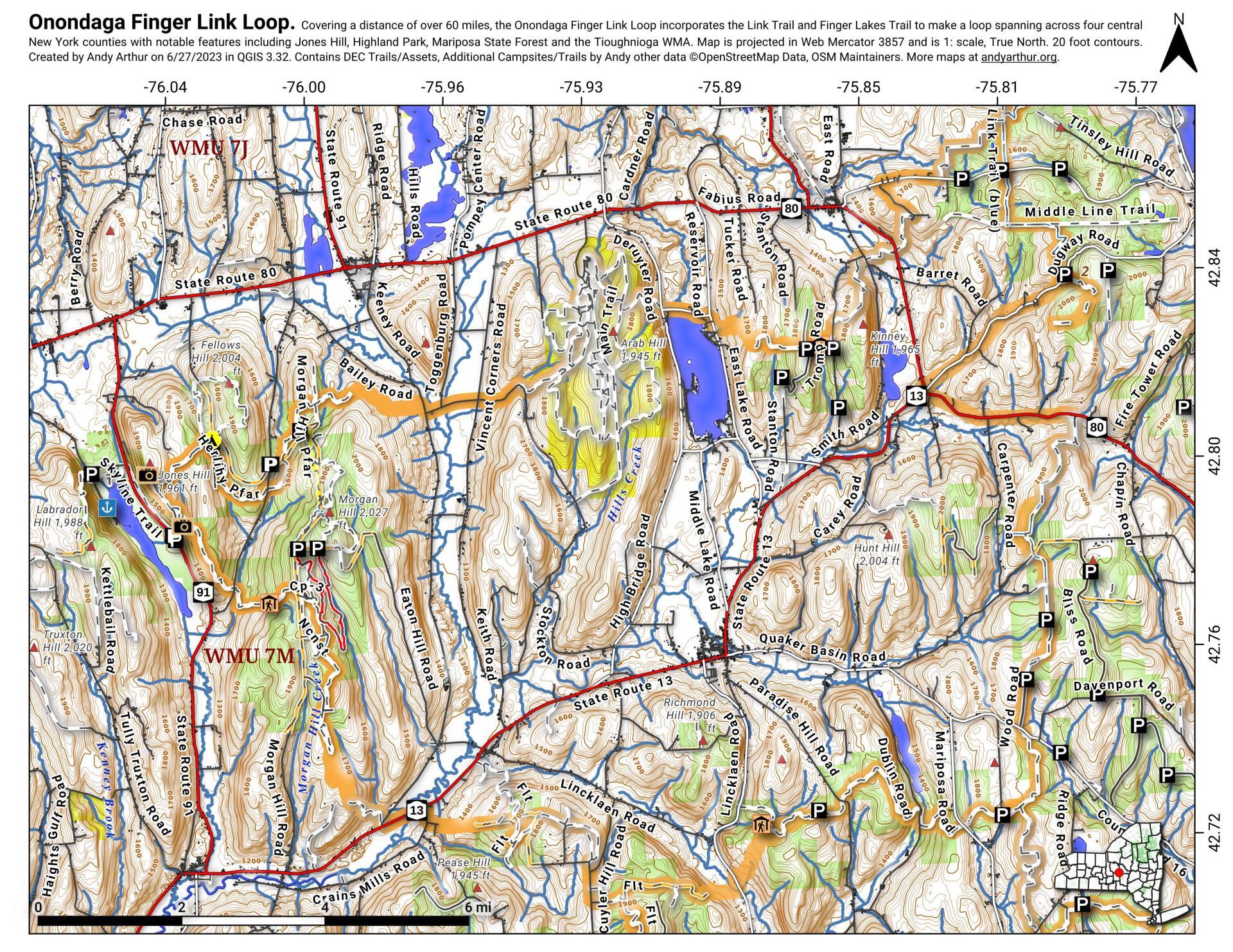 ... shows your location as a blue dot in relationship to campsites, trails, state land. This online map requires cell service, won't work in remote country, so also bring a paper map.