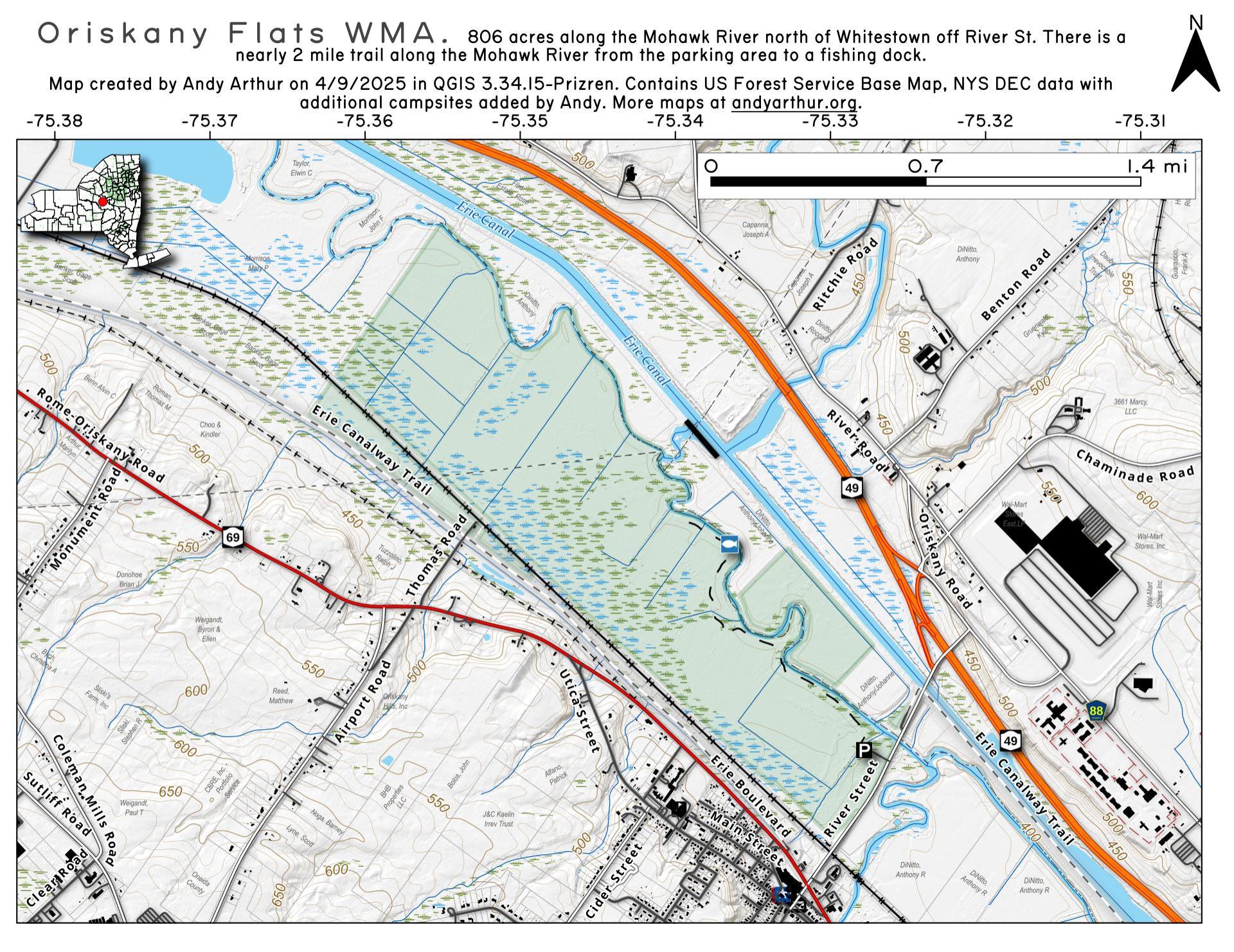 The Oriskany Flats Wildlife Management Area is a 774-acre parcel of public land open to a variety of recreational uses, while serving to maintain, protect, and enhance the natural qualities of this piece of the Mohawk River flood plain. The WMA is mostly sandwiched between the Mohawk River on the north and the CSX railroad to the south. Routes #49 and #69 roughly parallel the site.