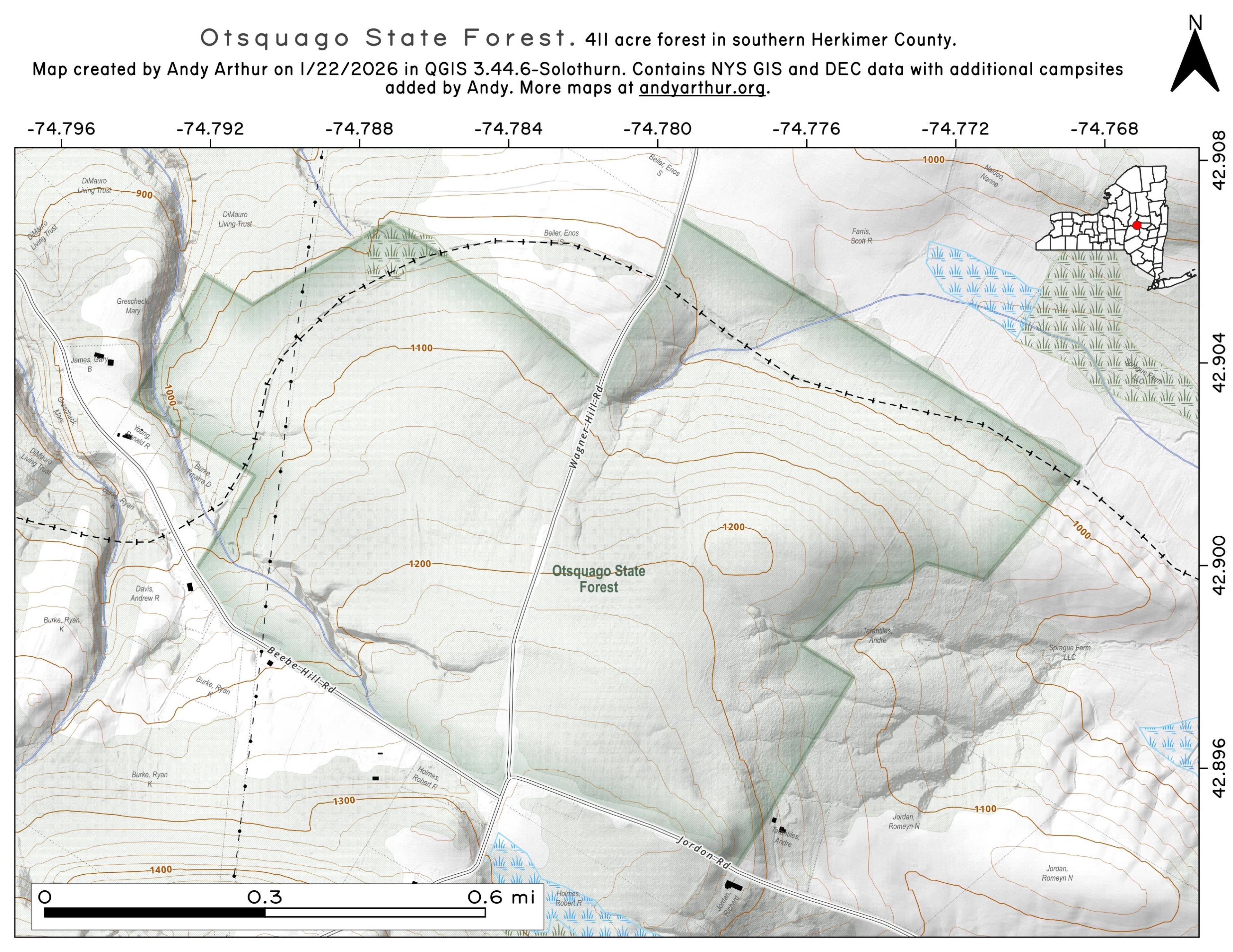 ... shows your location as a blue dot in relationship to campsites, trails, state land. This online map requires cell service, won't work in remote country, so also bring a paper map.