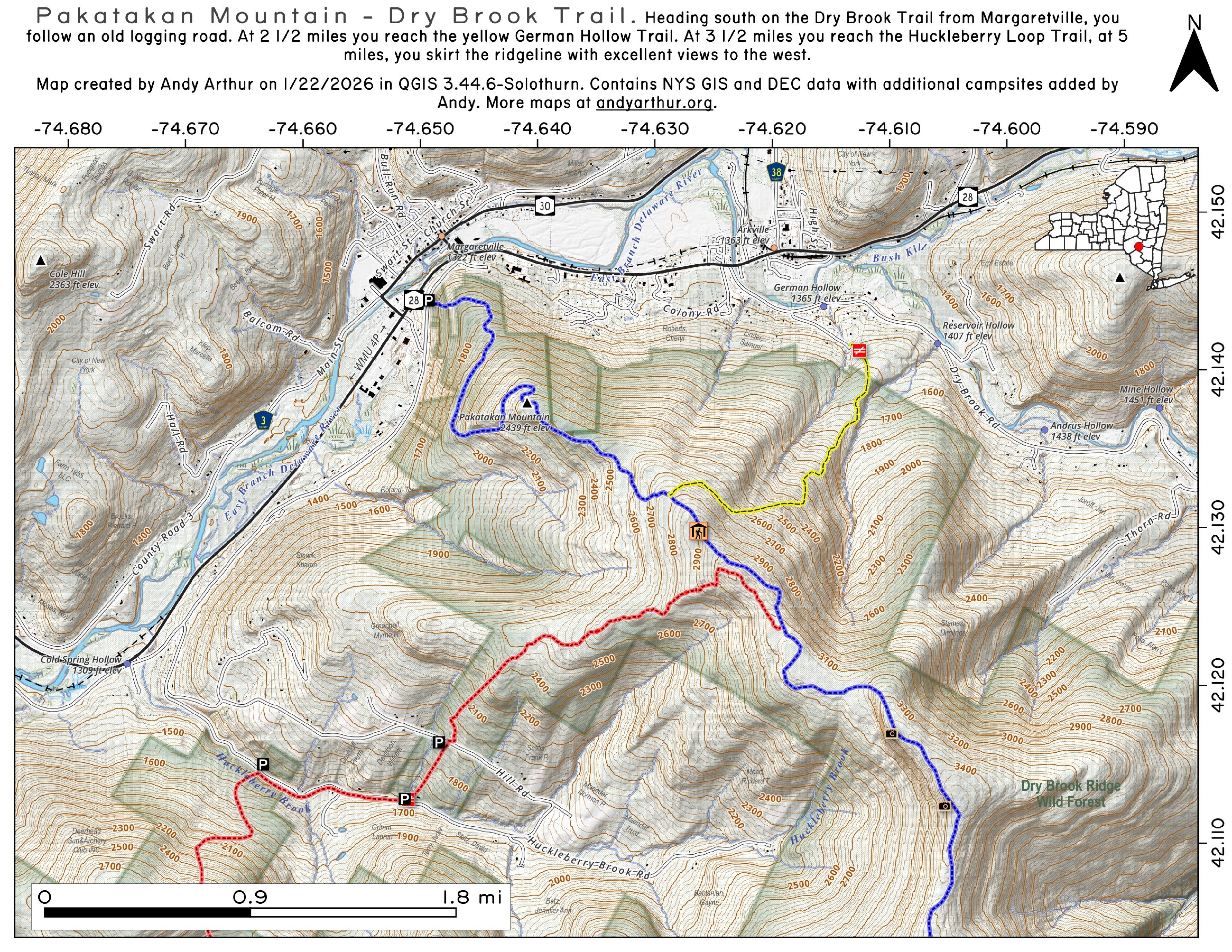 ... shows your location as a blue dot in relationship to campsites, trails, state land. This online map requires cell service, won't work in remote country, so also bring a paper map.
