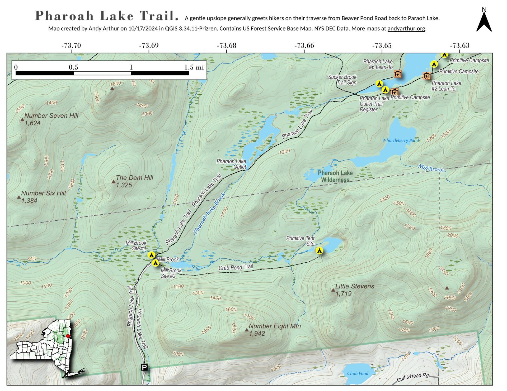 The Pharaoh Lake Wilderness Area, an Adirondack Park unit of New York's Forest Preserve, straddles the Essex County-Warren County line in the towns of Ticonderoga, Hague, Horicon and Schroon. The county road along the east shore of Schroon Lake forms the western boundary; to the north, private land and NY 74 form the boundary. The state land boundary forms most of the remaining perimeter except for a stretch of NY 8 on the south. The area contains 39 bodies of water covering 1,100 acres (4.4 km2), 62.8 miles (101 km) of foot trails, and 14 lean-tos. Download all maps as a PDF: https://www.scribd.com/document/640711783/Pharaoh-Lake-Wilderness-Map-Pack