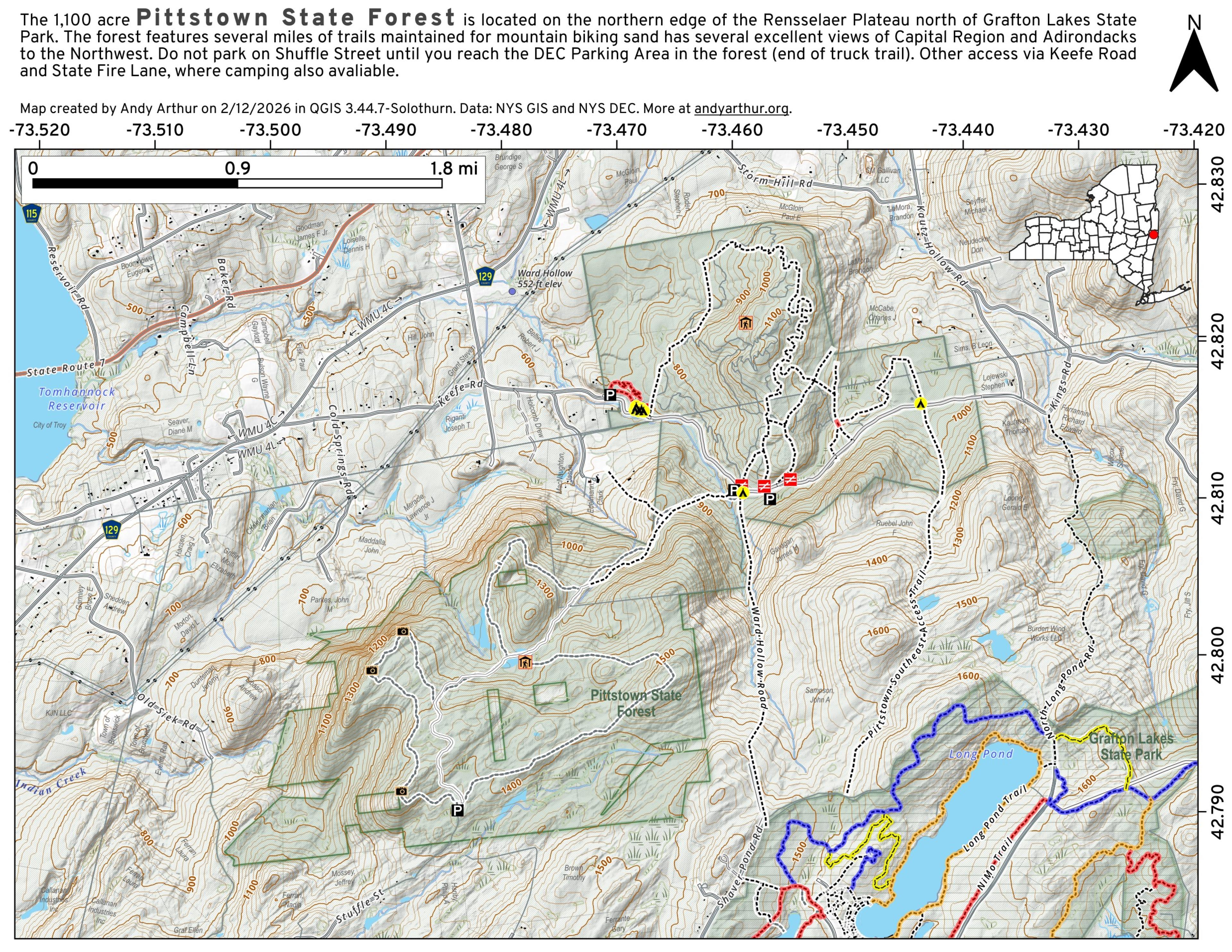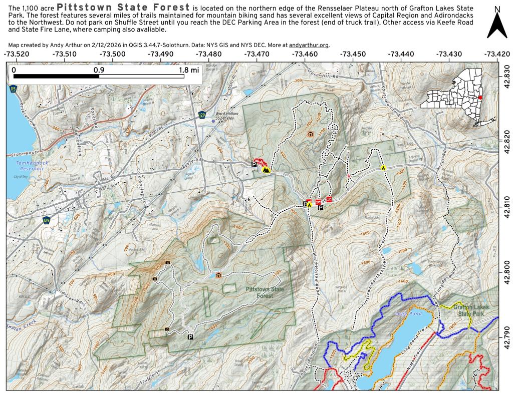 Pittstown State Forest is 1,167 acres north of Grafton Lakes State Park. It is crossed by an extensive network of mountain bike and snowmobile trails along with several old woods roads that link to trails at Grafton Lakes State Park.