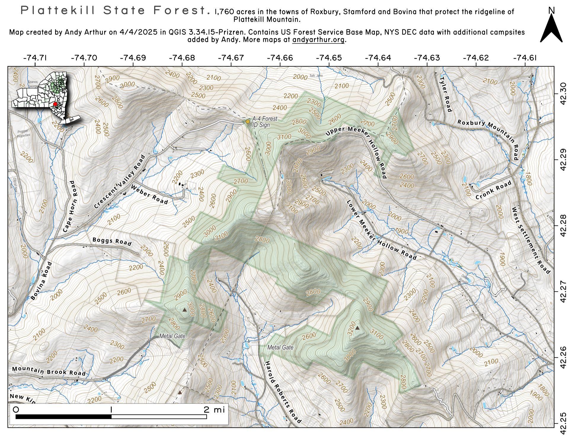 1,760 acres in the towns of Roxbury, Stamford and Bovina that protect the ridgeline of Plattekill. It is located just outside of the park's blue line, so it's managed as state forest rather then forest preserve.