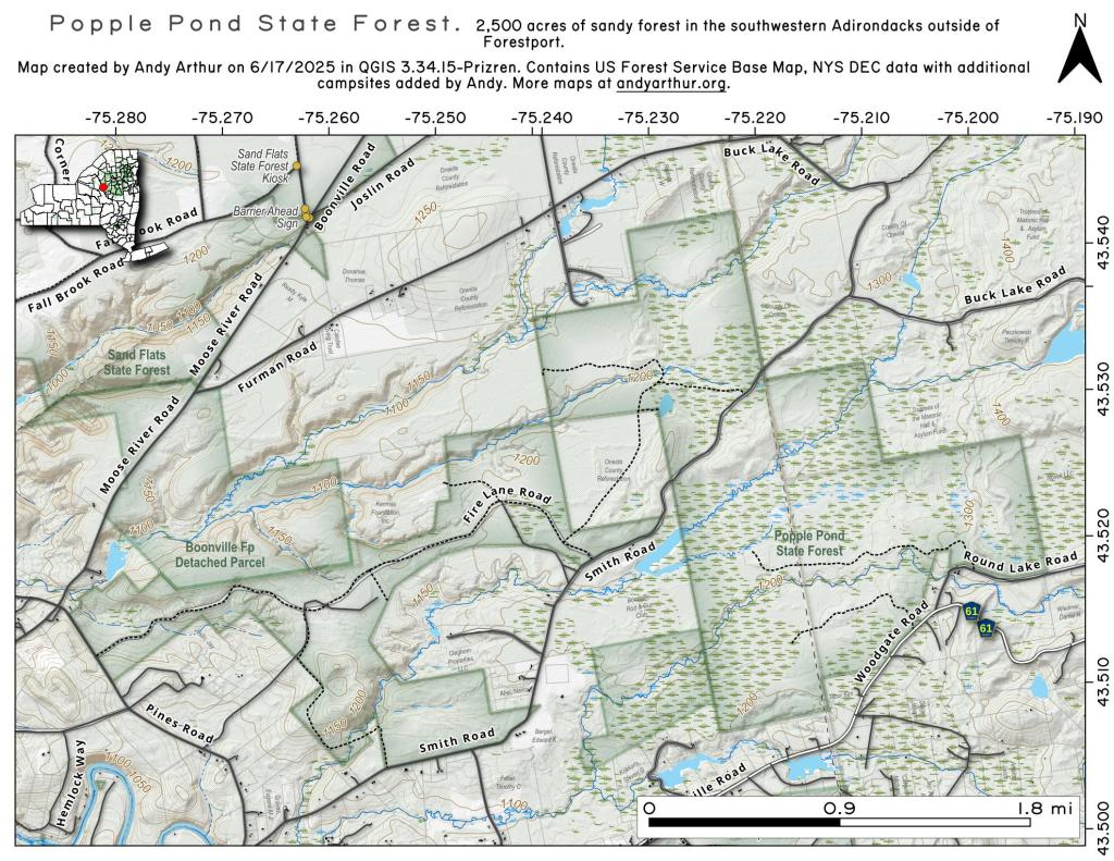 Popple Pond State Forest is 2,445 acres of state forest interspersed with detacheed forest preserve parcels outside of Boonville. To the north is Sand Flats State Forest (2,526 acres) and to the south is Hogback State Forest (1,115 acres).