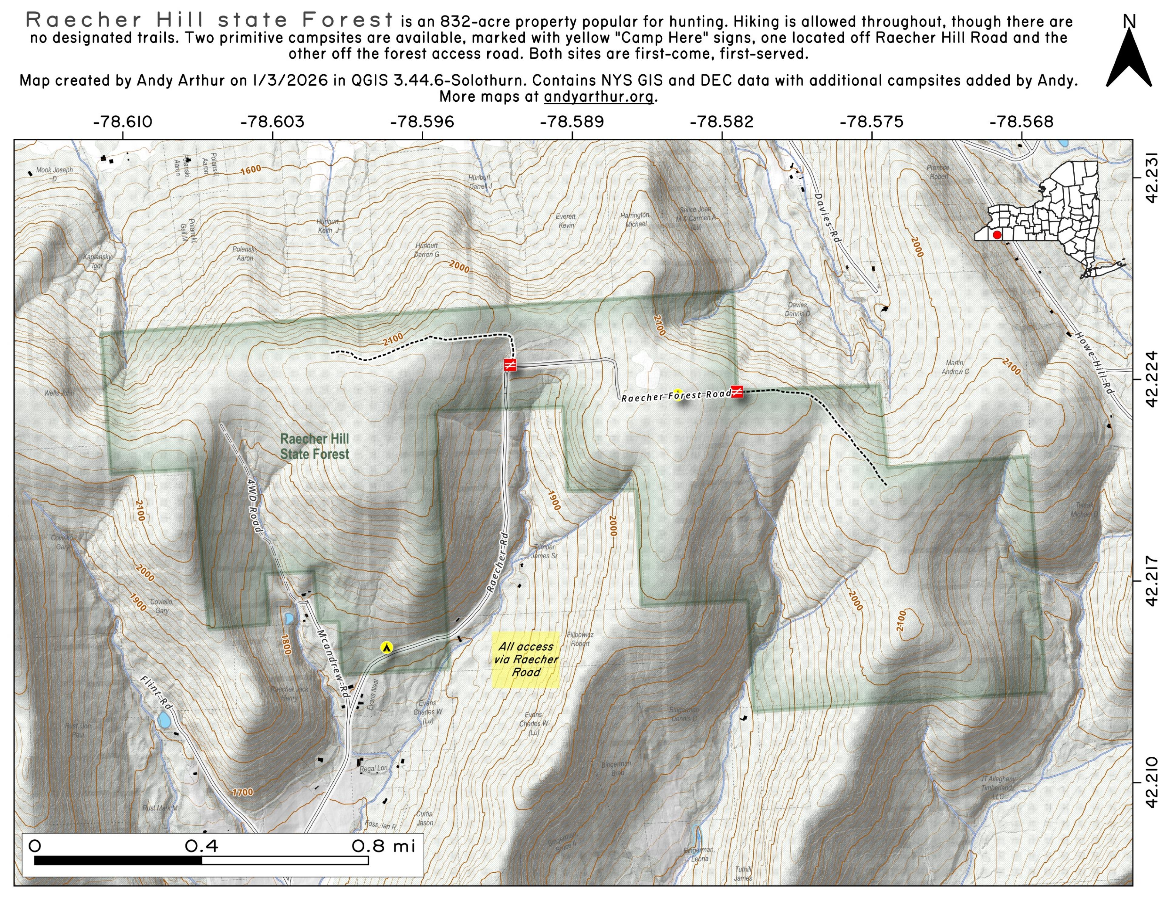 There are two designated camp sites on the property: one is off Raecher Hill Road and one off the forest access road. Both are marked with a yellow "Camp Here" markers.