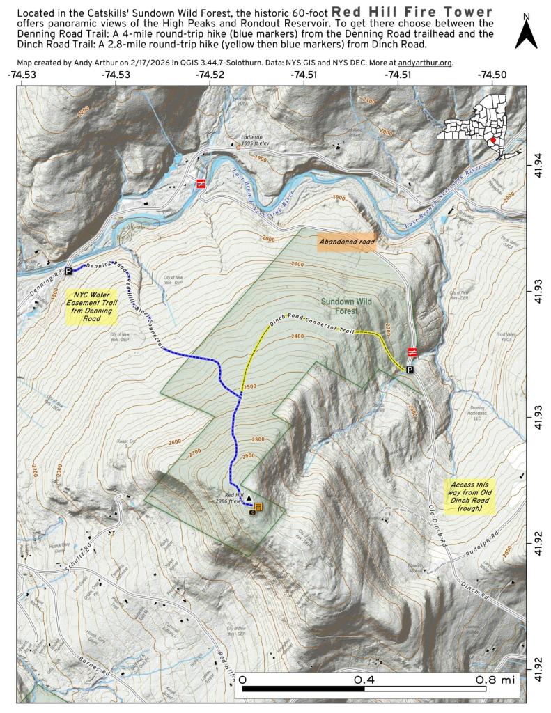 The Red Hill Fire Tower stands 60 feet tall, has nine flights of stairs, and was constructed in 1921. This tower affords an unsurpassed view of the Catskill high peaks to the west and north, and the Rondout Reservoir to the southeast. It was the last fire tower staffed in the Catskills, closing in 1990.