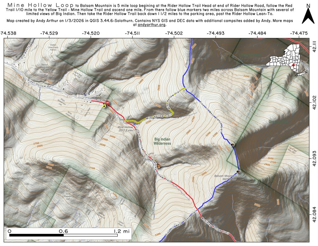 ... shows your location as a blue dot in relationship to campsites, trails, state land. This online map requires cell service, won't work in remote country, so also bring a paper map.