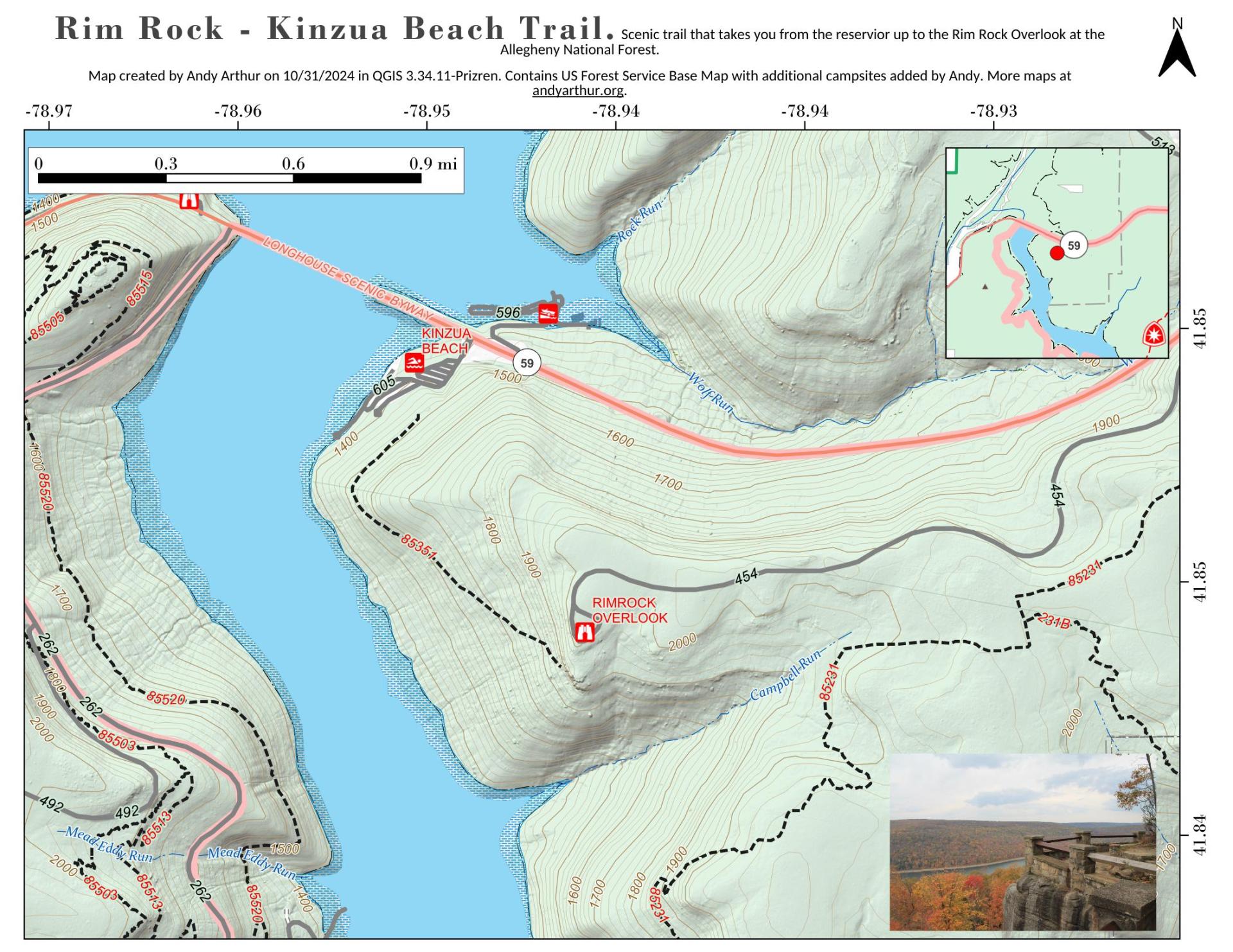 Rimrock Overlook offers a scenic view of Kinzua Bay, which extends southwest from the main body of the Allegheny Reservoir. The overlook is a 200 foot elevation drop from the parking area (via steps). Facilities include: vault toilets, paved & gravel paths to picnic area with tables and grills. The access road (2.5 miles) from State Route 59 is designated as a cross country ski trail during winter activity season 12/15 - 4/1.