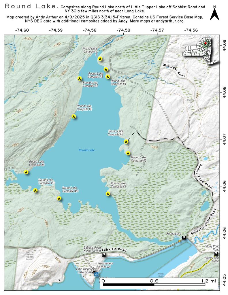 Round Lake is a popular lake near Little Tupper Lake off of Sabbist Road in the Round Lake Wilderness, which was created in 2007. Home to several campsites, and good paddling without the cross winds of Little Tupper Lake, it offers paddling from an easy pull-off on Sabbist Road.