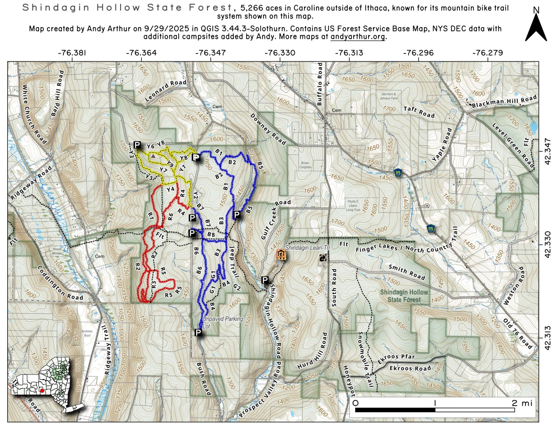 Shindagin Hollow State Forest (Tompkins #3) covers 5,266 acres of land in the towns of Caroline in southern Tompkins County and Candor in northern Tioga County. Its large size and good access from public roads make this a great forest to enjoy activities such as mountain biking, hunting, hiking, snowmobiling, cross-country skiing, bird watching, nature viewing, picnicking and camping.