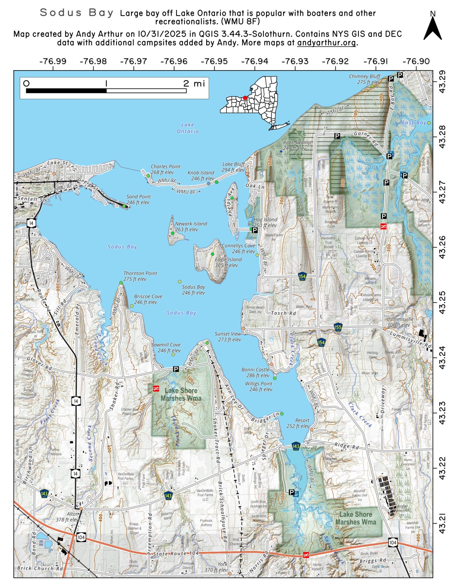 Wayne County is in the western part of New York State, east of Rochester and northwest of Syracuse, on the south shore of Lake Ontario. Sodus Bay is located on the north shoreline of the county. Wayne is bounded by five other New York counties: the northern boundary is Lake Ontario with Canada on the opposite shore; the western boundary is Monroe County; and the eastern boundary is Cayuga County; the south boundary is shared with Ontario and Seneca counties.