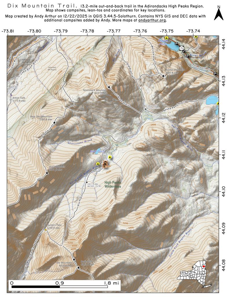 ... shows your location as a blue dot in relationship to campsites, trails, state land. This online map requires cell service, won't work in remote country, so also bring a paper map.