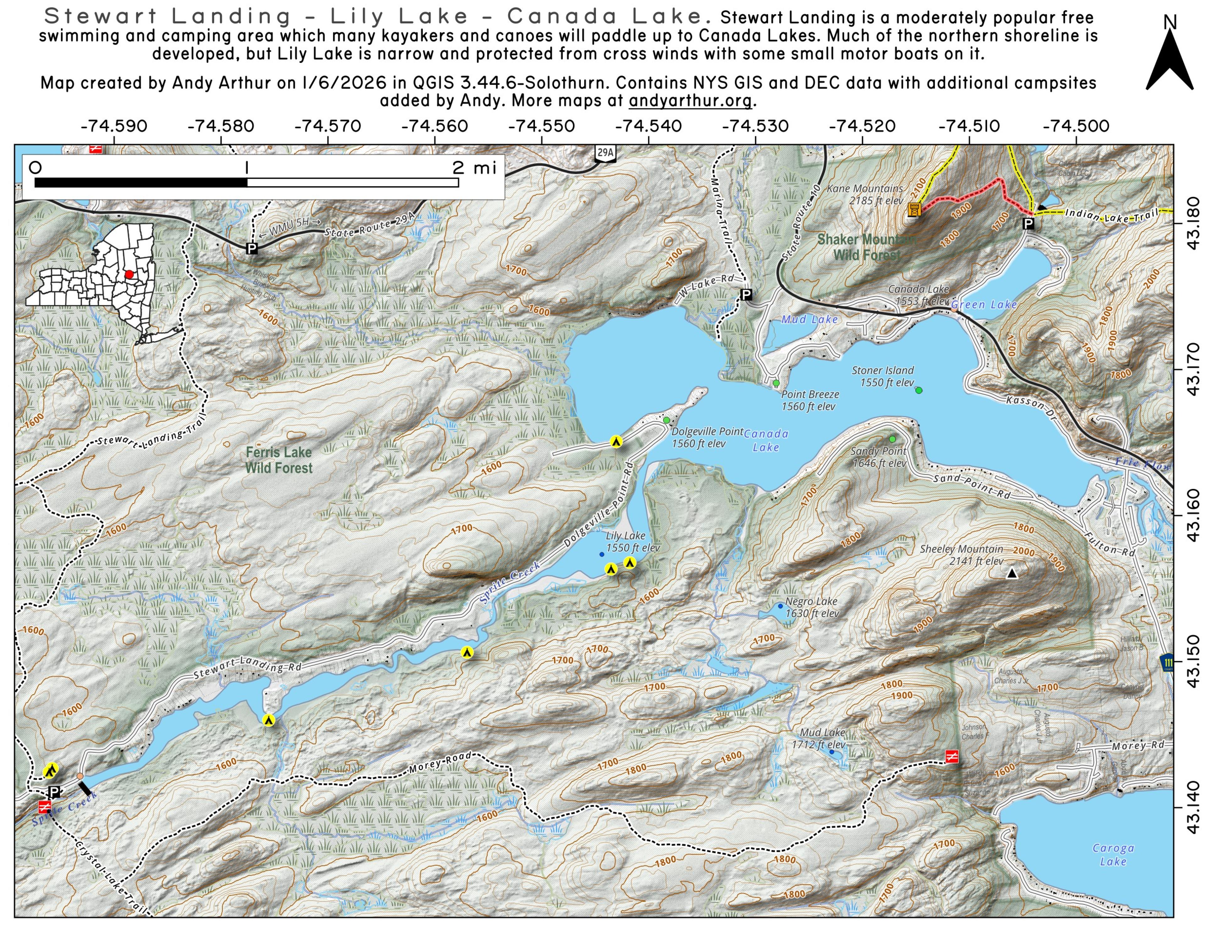 Stewart Landing is a popular cartop boat launch for West Canada Lake - Lily Lake - Middle Sprite Creek. Just up the road from Stewart Landing Dam on East Canada Lake, there are 4 designated campsites with vehicle access. This is also a popular primative swimming beach and fishing location.