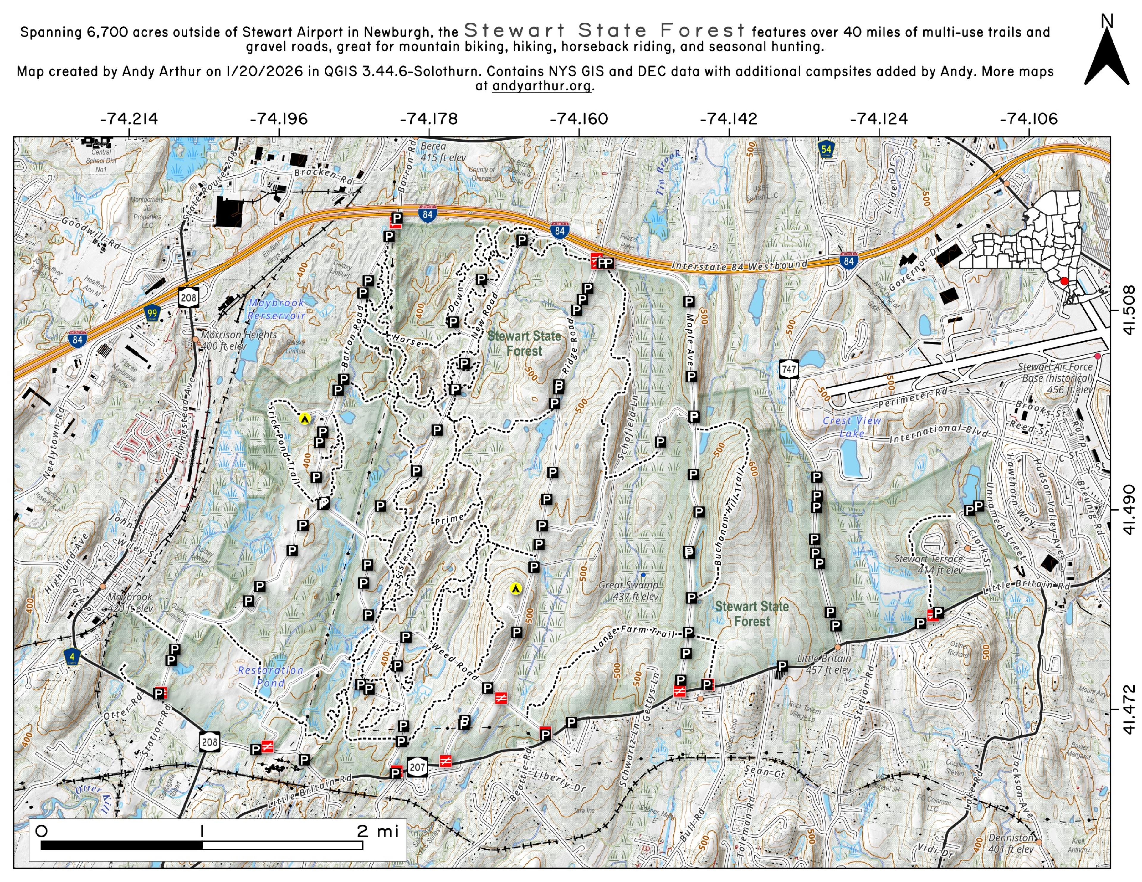 Hiking: Hiking is allowed on the property. Please see the attached map for trail locations. Please note that unless specifically posted as foot trails, all trails on the property are multiple use trails. Roadways on Stewart State Forest are accessible by car for people with disabilities, but a permit must first be obtained from DEC. Special arrangements must be made to obtain combinations for entry at selected gates.