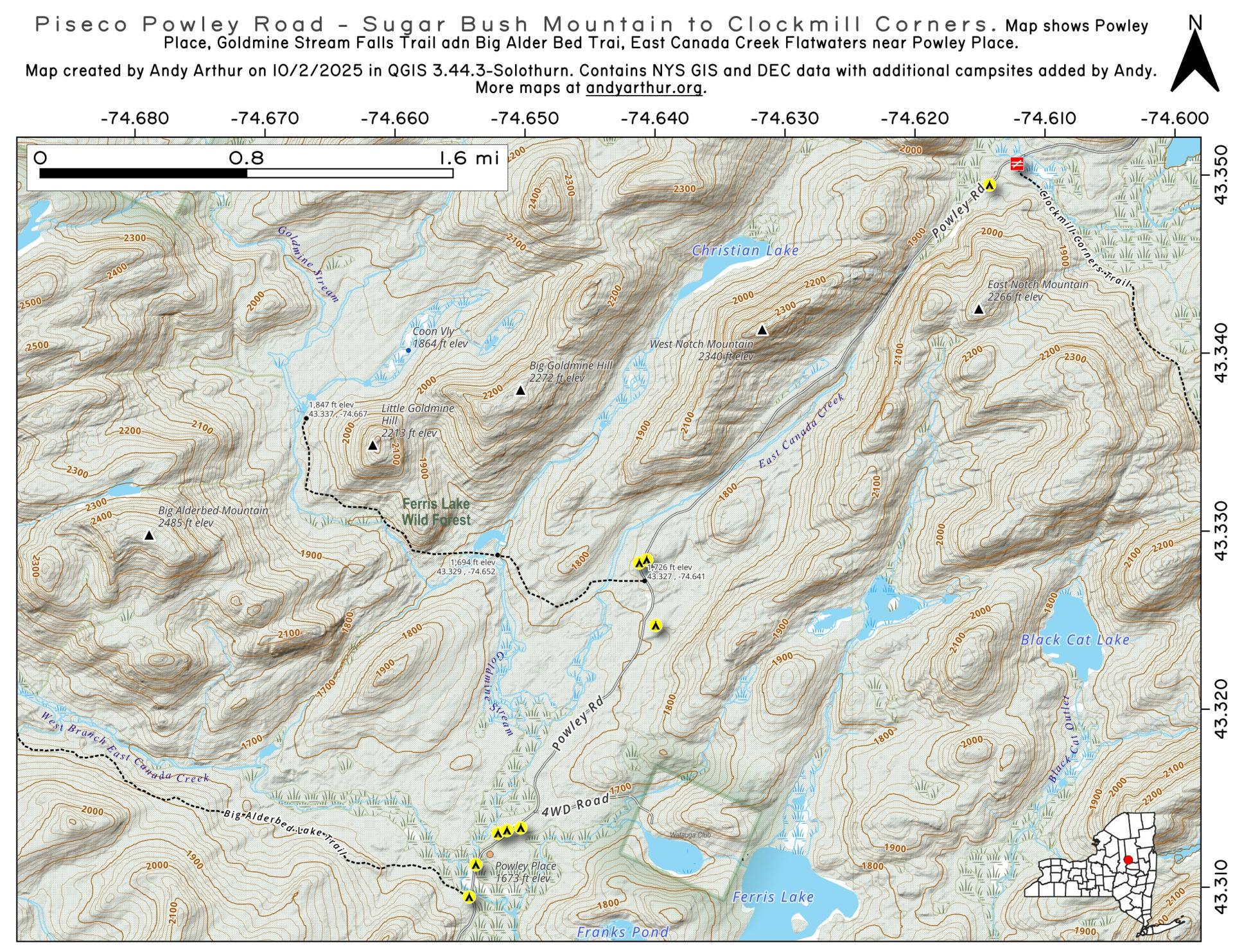 Get maps of campsites and destinations as a single-page PDF here: https://www.scribd.com/document/640949248/Piseco-Powley-Road-Campsite-Map-Pack