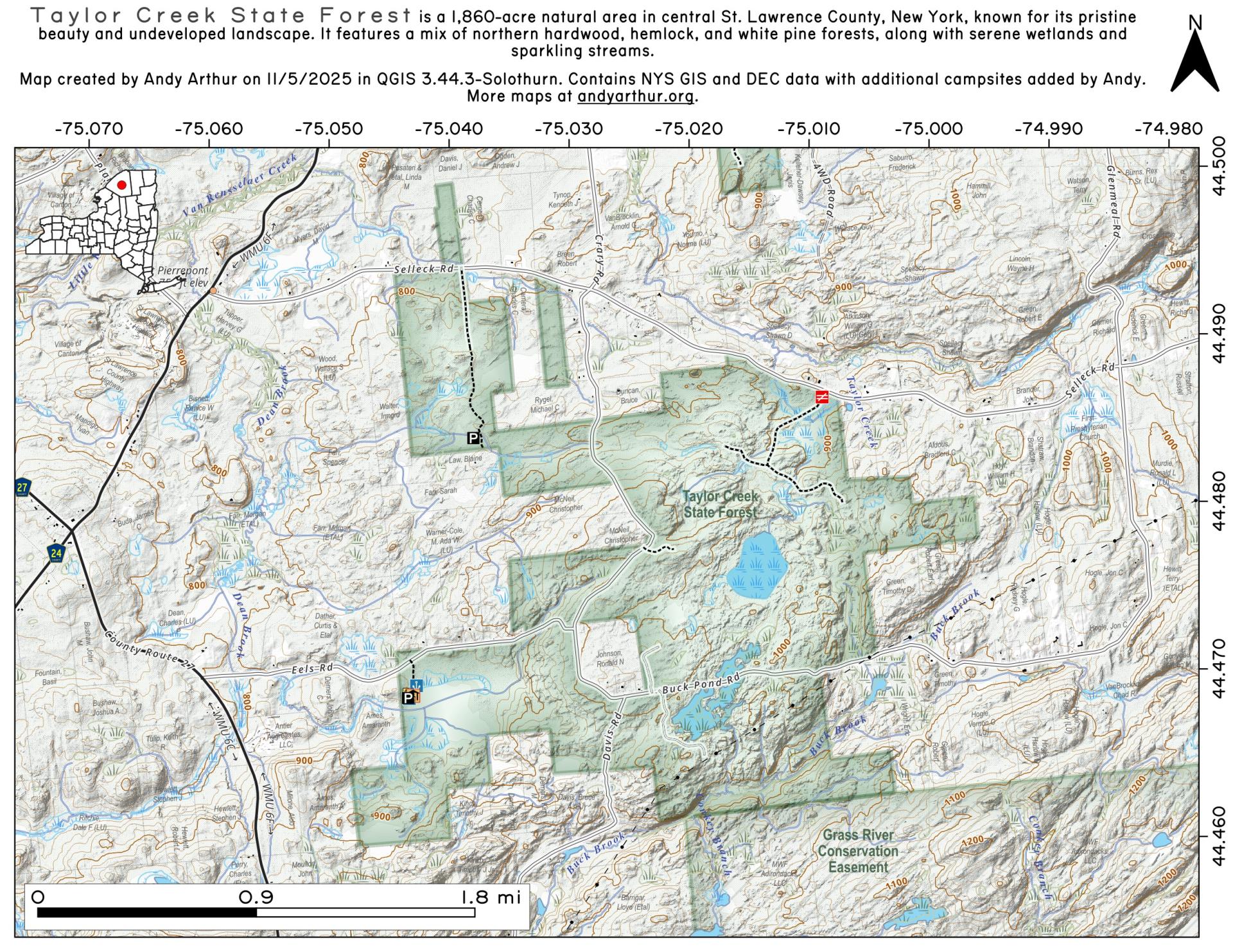 Taylor Creek State Forest is composed of 1,860 acres located in the town of Pierrepont in central St. Lawrence County.