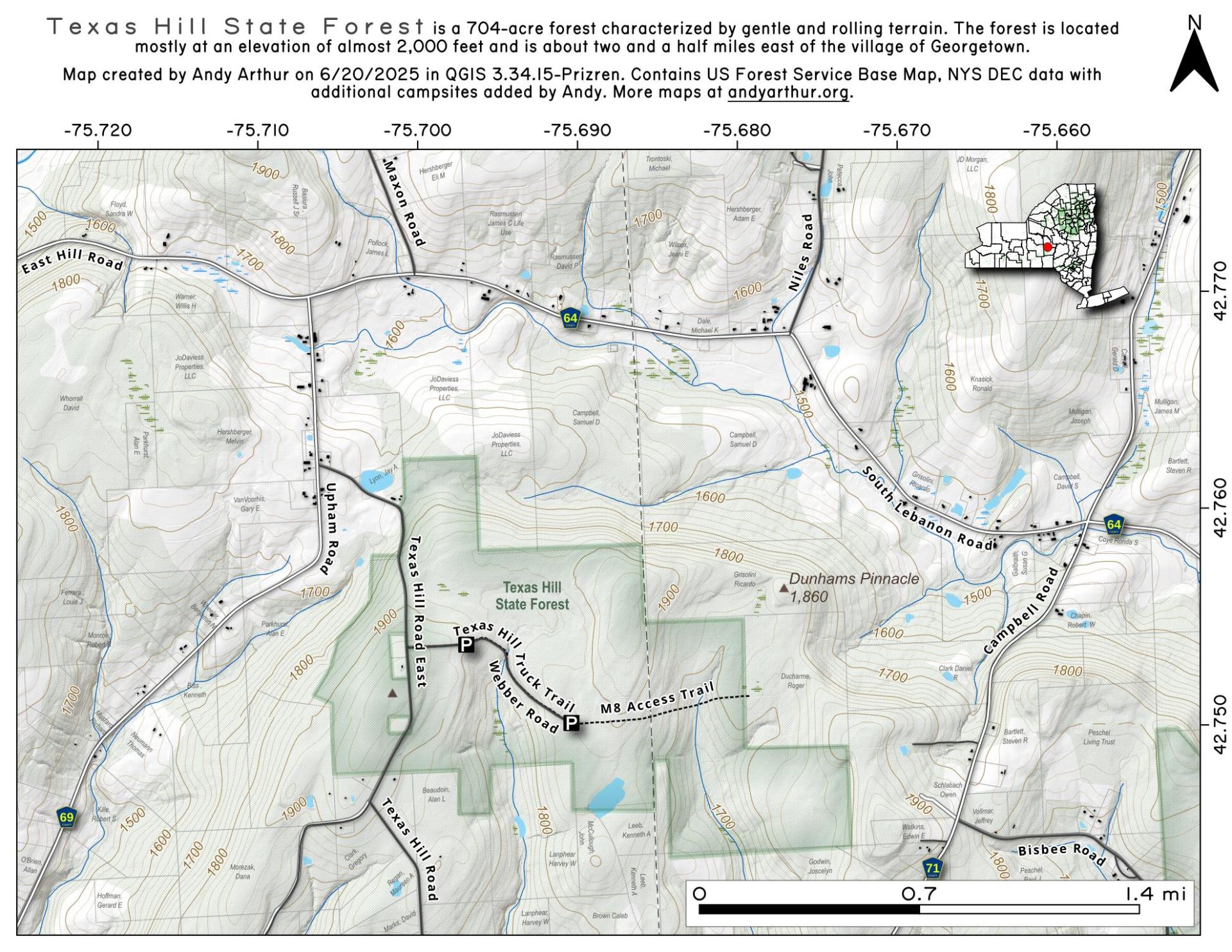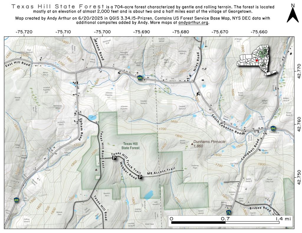 Texas Hill State Forest, is a 704-acre forest characterized by gentle and rolling terrain. There are no formal recreational trails or facilities on this state forest. A single public forest access road can be used to enter the forest.