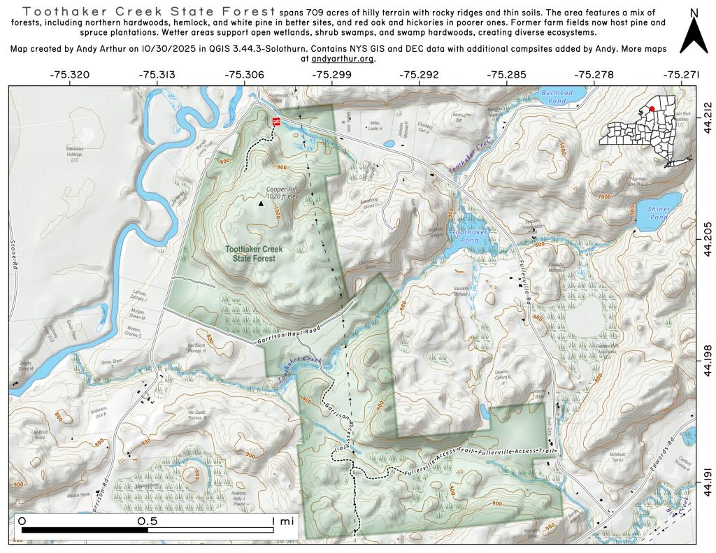 Toothaker Creek State Forest covers 709 acres. The topography is very hilly with thin soils and rocky exposed ridge tops predominating. Better quality upland sites support a mixture of northern hardwood, hemlock, and white pine forests. Lower quality upland sites are dominated by red oak, eastern hophornbeam, hickories, and other species adapted to droughty and nutrient poor soils. Pine and spruce plantations were established on what were formerly farm fields and pastures. Flatter ground supports open wetlands and shrub swamps, which gradually transition to swamp hardwoods in seasonal flooded areas.
