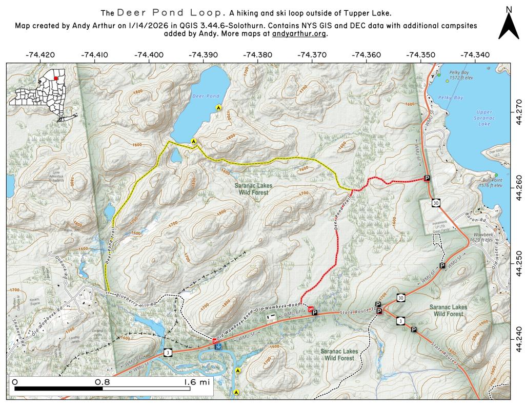 ... shows your location as a blue dot in relationship to campsites, trails, state land. This online map requires cell service, won't work in remote country, so also bring a paper map.