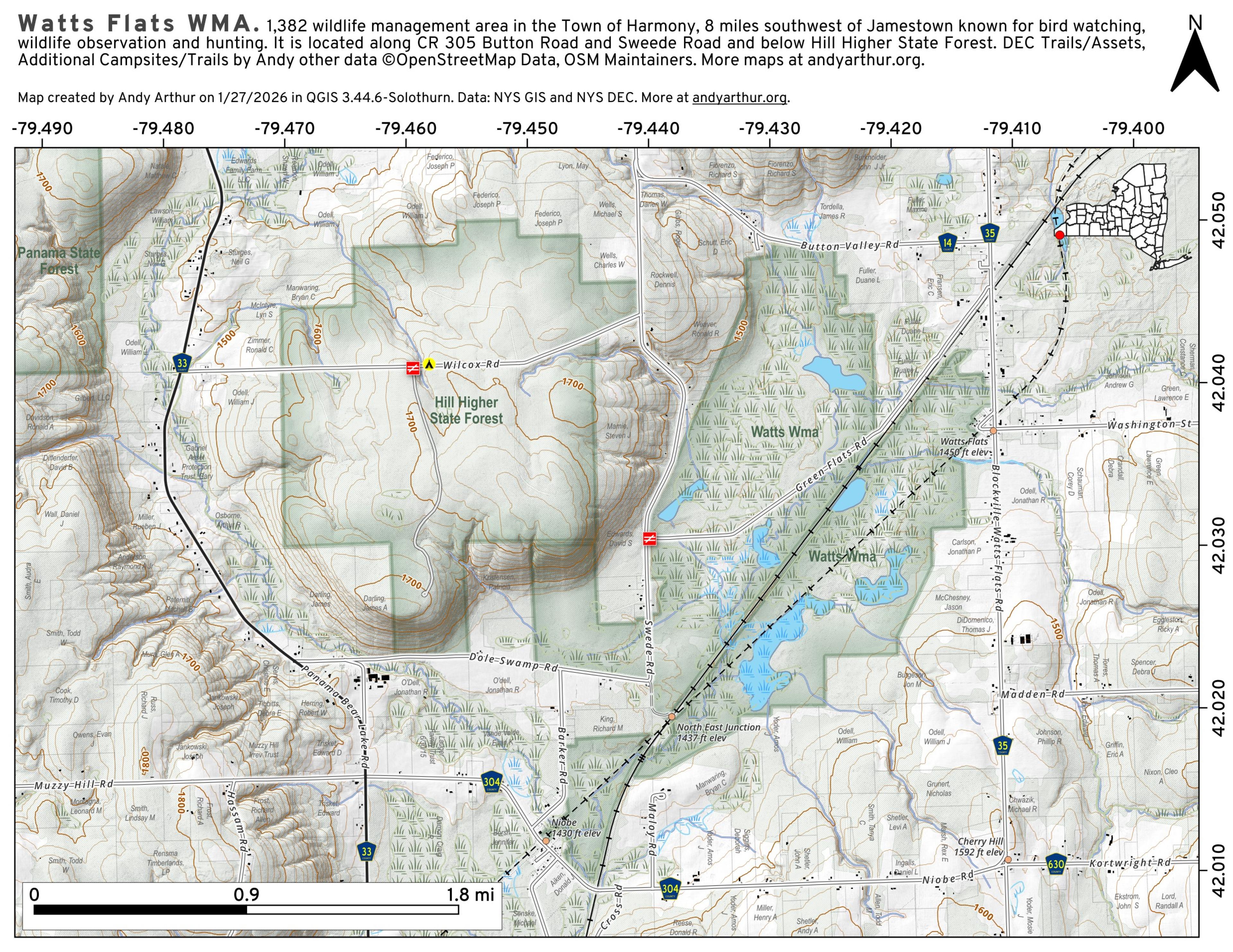 Watts Flats WMA is located approximately eight miles southwest of the city of Jamestown and three miles southeast of the village of Panama in Chautauqua County. The area is primarily made up of wetland habitat.