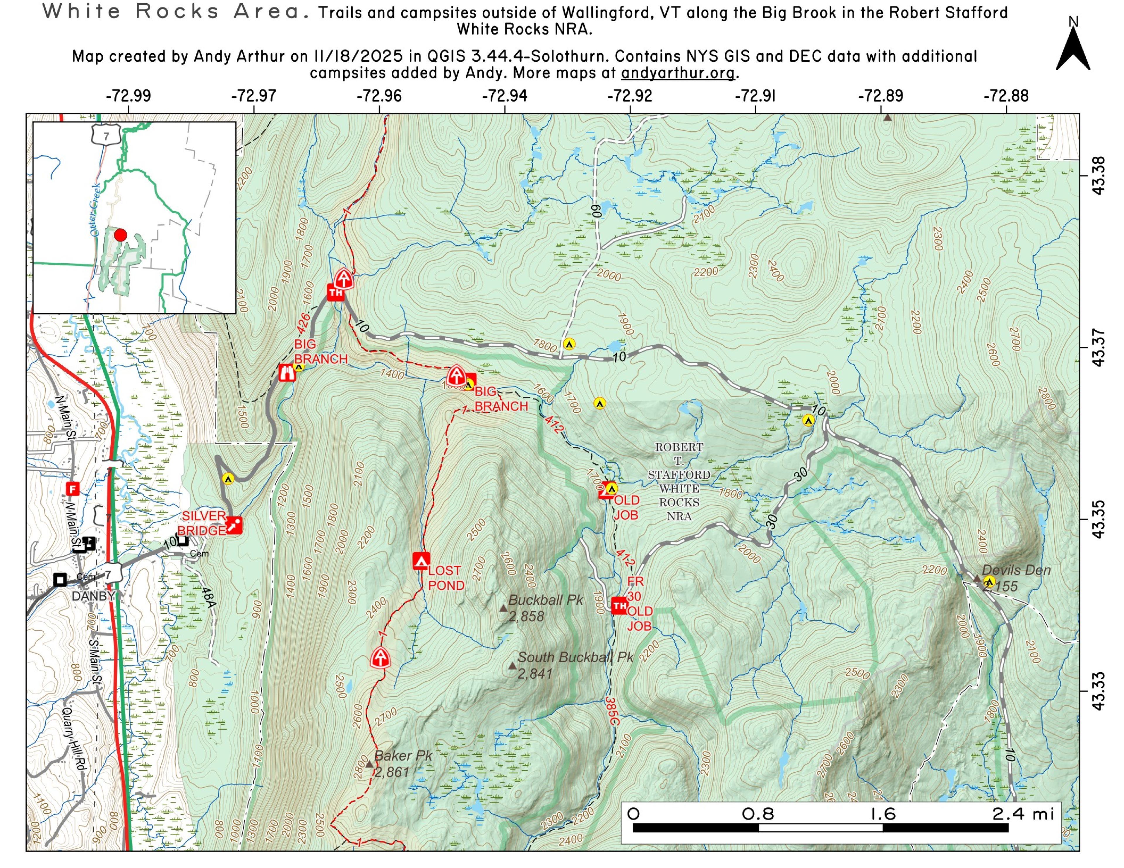 The main road through the White Rocks National Recreation Area is Forest Road 10, which is also known as Danby-Landgrove Road. It home to many campsites.