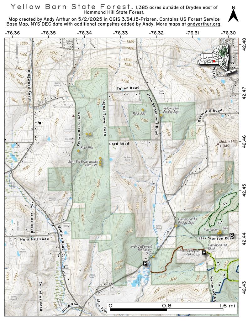 Yellow Barn State Forest covers 1,289 acres of land. The forest is primitive in nature and passive recreational activities such as hunting, trapping, and snowmobiling can be enjoyed.