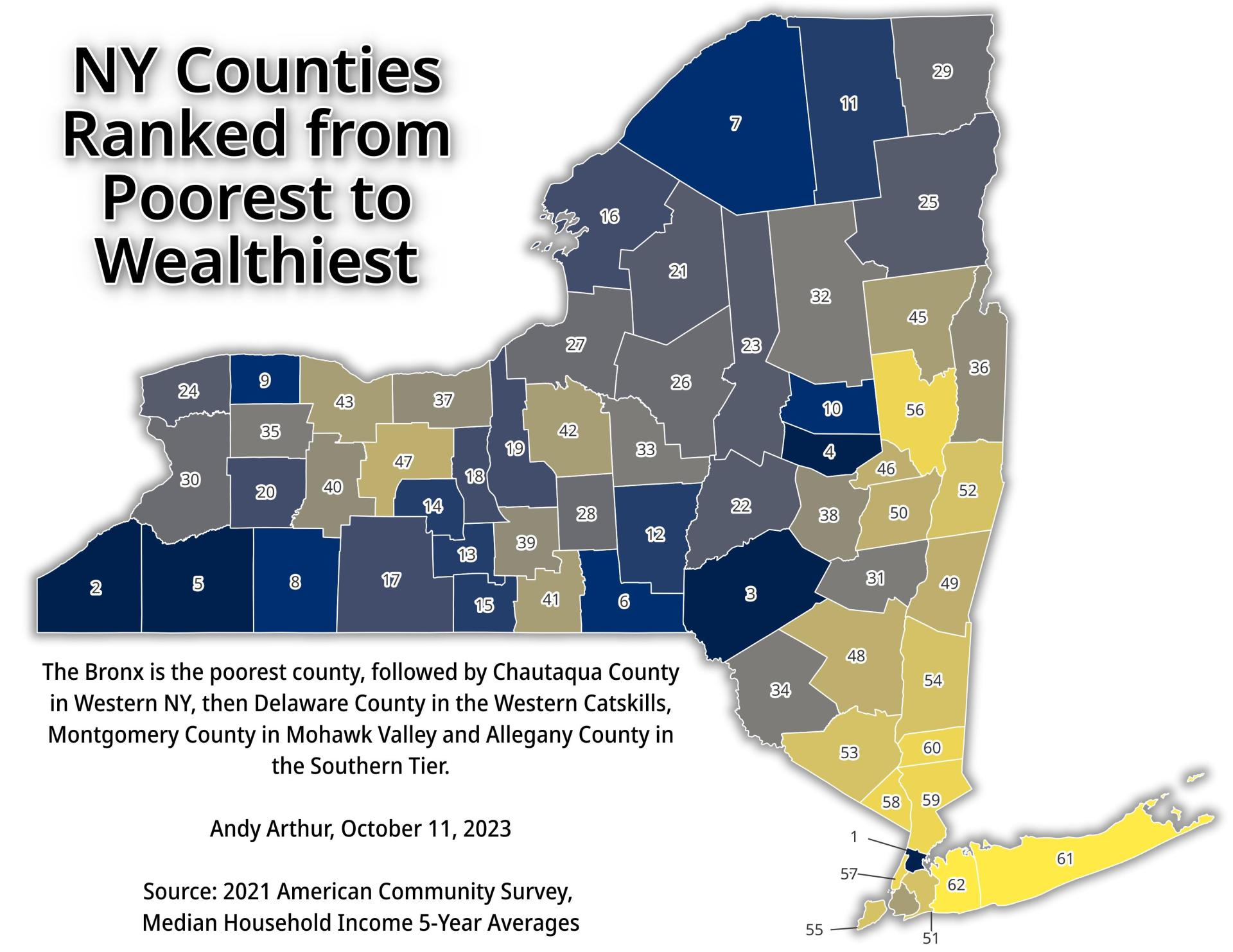 Thematic Map: New York Counties Ranked from Poorest to Wealthiest Download a High Resolution JPEG Image of the New York Counties Ranked from Poorest to Wealthiest or an Adobe Acrobat Printable PDF of the Thematic New York Counties Ranked from Poorest to Wealthiest. More about NYS Census...New York State mapped and discussed, using Census data. Lots of interesting infographics can be found here. Maps and InteractivesWalking Distance from HomePopulation Density of New York StateNY School District Population DensityNew York State County Population DensityMost Common Heating Fuel in New York StateLarge Urban Counties are gaining population in New York StateFifty Least Densely Populated Municipalities in NY StateEach Dot Represents 1,000 New YorkersAn Irish Conundrum9 Out of Ten New Yorkers Live Here5 Percent2023 Births Per 1,000 Women Aged 15-442020 US Census Urban Areas in New York StateNYS Median Household Income by MunicipalityNew York Counties Ranked from Poorest to WealthiestHigh School Drop Outs Map... photos, maps and other content from from NYS Census. Leave a Reply Cancel replyYour email address will not be published. Required fields are marked *Comment * Name * Email * Website Save my name, email, and website in this browser for the next time I comment. Δ