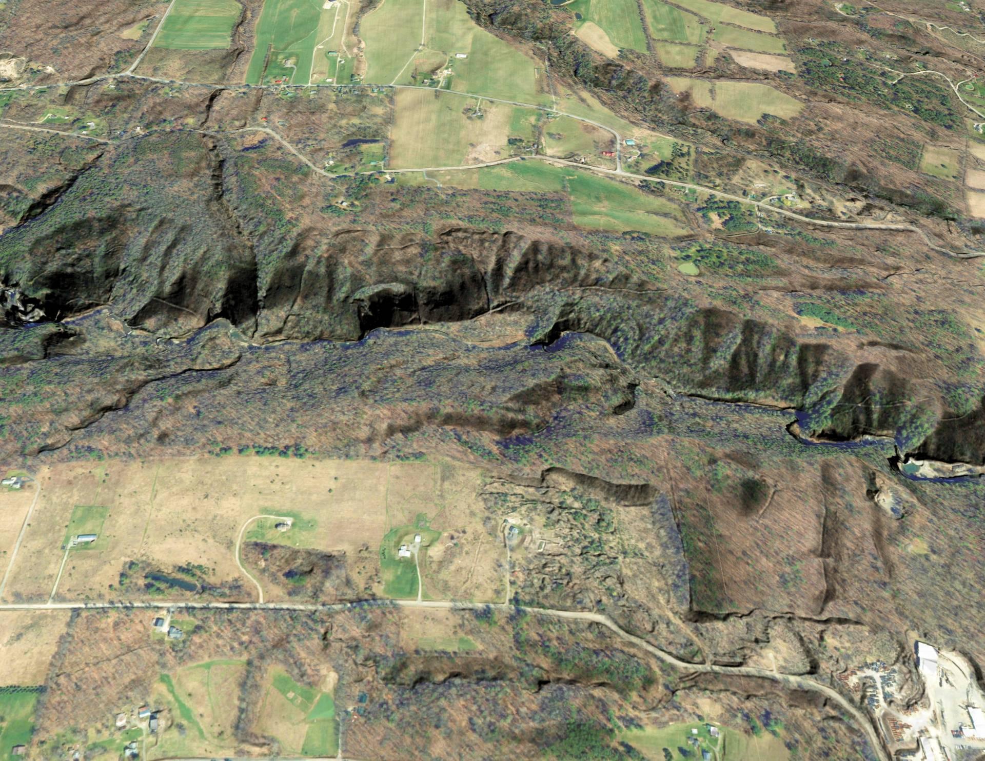 The park has numerous waterfalls along a rigorous 4.5-mile (7.2 km) round-trip hike. Like many of the state parks in the Finger Lakes region, the hiking trails follow a small creek (Enfield Creek, in this case), giving many views of the rock formations in the deep, narrow gorge (Enfield Glen). A natural swimming pool is located at the easternmost waterfall, "Lower Falls." A large (over 100 ft (30 m). high), multi-tiered cascading waterfall, "Lucifer Falls," is a short hike from the top (western) part of the park. The most spectacular view of Lucifer falls can be found along the gorge trail, although there are also overlooks along the rim trail. Finger Lakes Trail skirts the southern edge of the park.