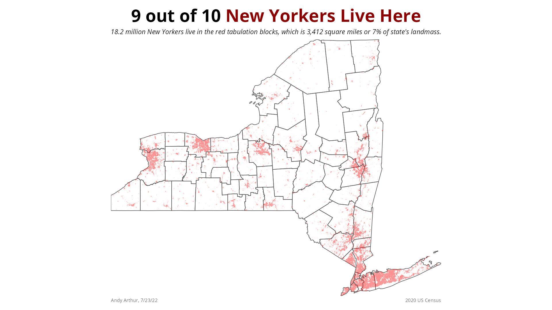 Thematic Map: 9 Out of Ten New Yorkers Live Here Download a High Resolution JPEG Image of the 9 Out of Ten New Yorkers Live Here or an Adobe Acrobat Printable PDF of the Thematic 9 Out of Ten New Yorkers Live Here. More about NYS Census...New York State mapped and discussed, using Census data. Lots of interesting infographics can be found here. Maps and InteractivesWalking Distance from HomePopulation Density of New York StateNY School District Population DensityNew York State County Population DensityMost Common Heating Fuel in New York StateLarge Urban Counties are gaining population in New York StateFifty Least Densely Populated Municipalities in NY StateEach Dot Represents 1,000 New YorkersAn Irish Conundrum9 Out of Ten New Yorkers Live Here5 Percent2023 Births Per 1,000 Women Aged 15-442020 US Census Urban Areas in New York StateNYS Median Household Income by MunicipalityNew York Counties Ranked from Poorest to WealthiestHigh School Drop Outs Map... photos, maps and other content from from NYS Census. Leave a Reply Cancel replyYour email address will not be published. Required fields are marked *Comment * Name * Email * Website Save my name, email, and website in this browser for the next time I comment. Δ