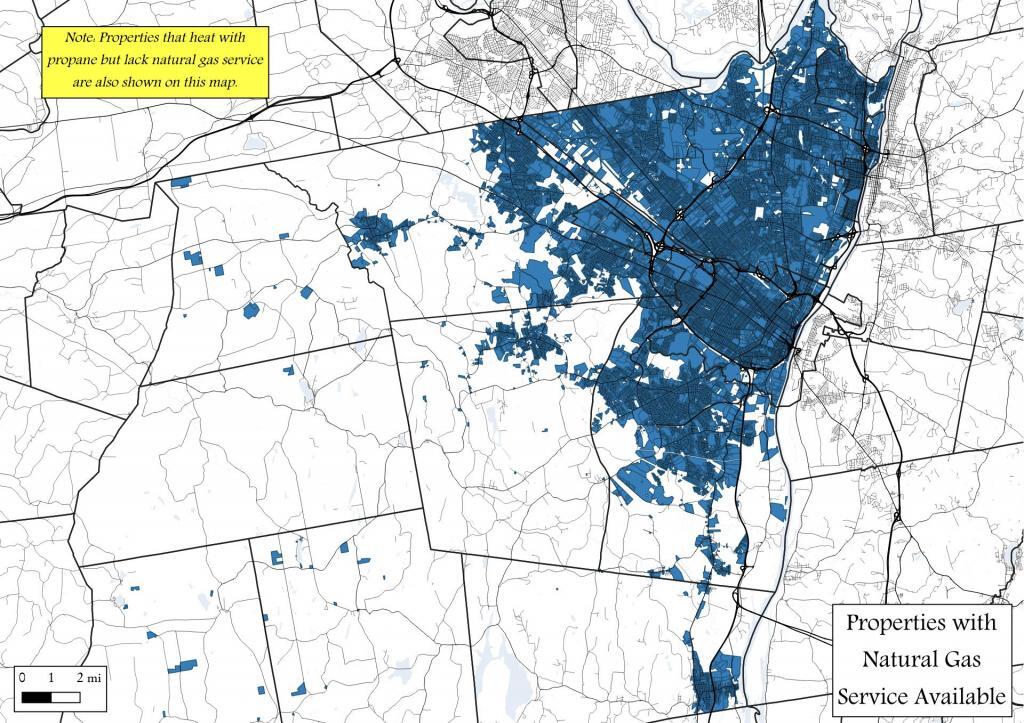 I thought it would be interesting to see how far out gas service goes across Albany County. It turns out that most urban and suburban properties in the county are serviced by gas lines.