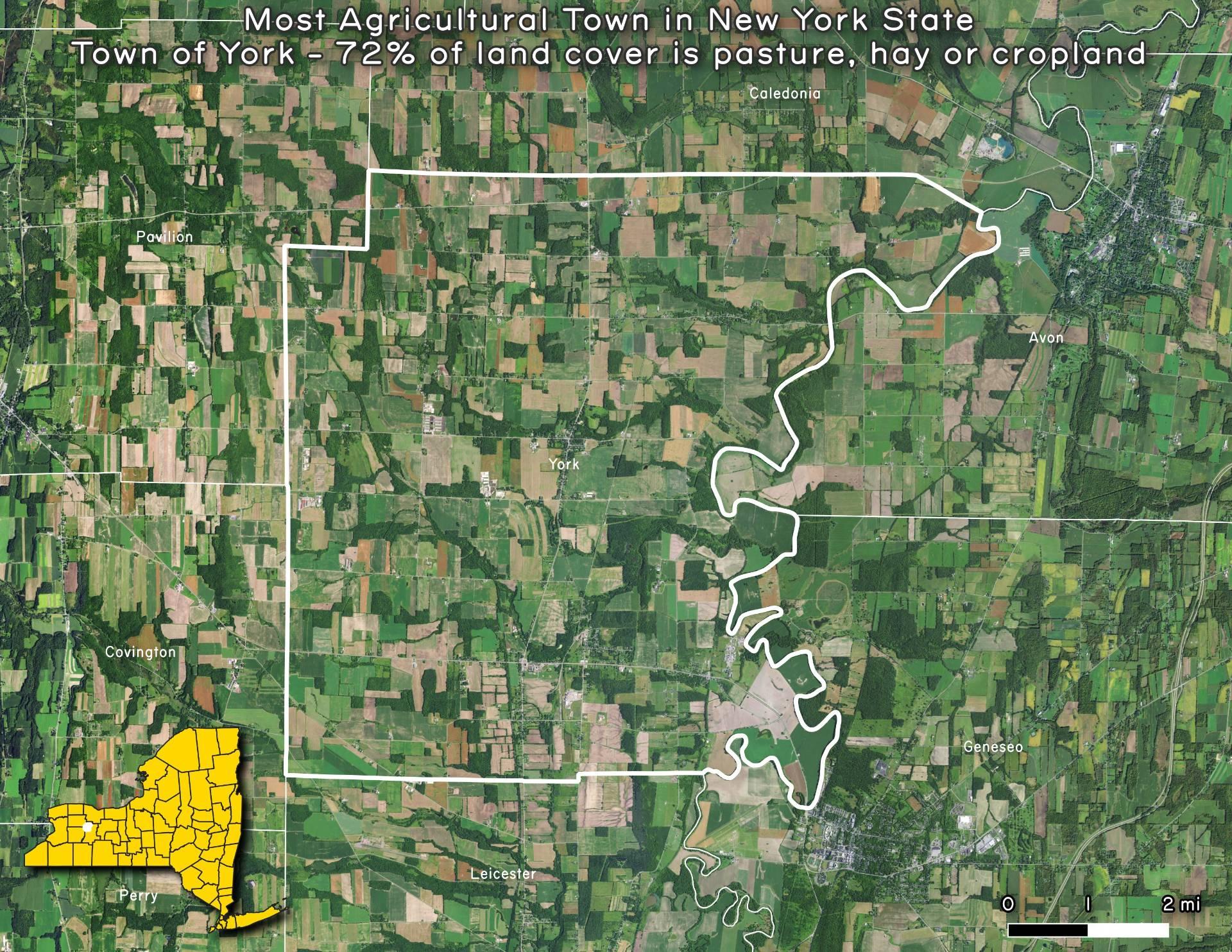 What town has the largest percentage of land cover used for agricultural purposes? Town of York in Livingston County - 9.1 percent is hay/pasture, 62.8 percent is cropland making it the state's town with the most agriculture as a percentage of area.