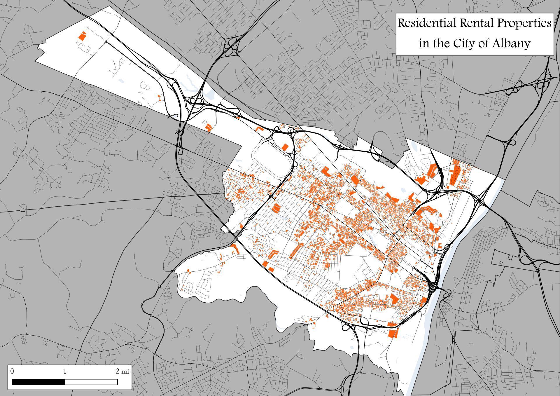 Download a High Resolution JPEG Image of the Residential Rental Properties in the City of Albany or an Adobe Acrobat Printable PDF of the Thematic Residential Rental Properties in the City of Albany.