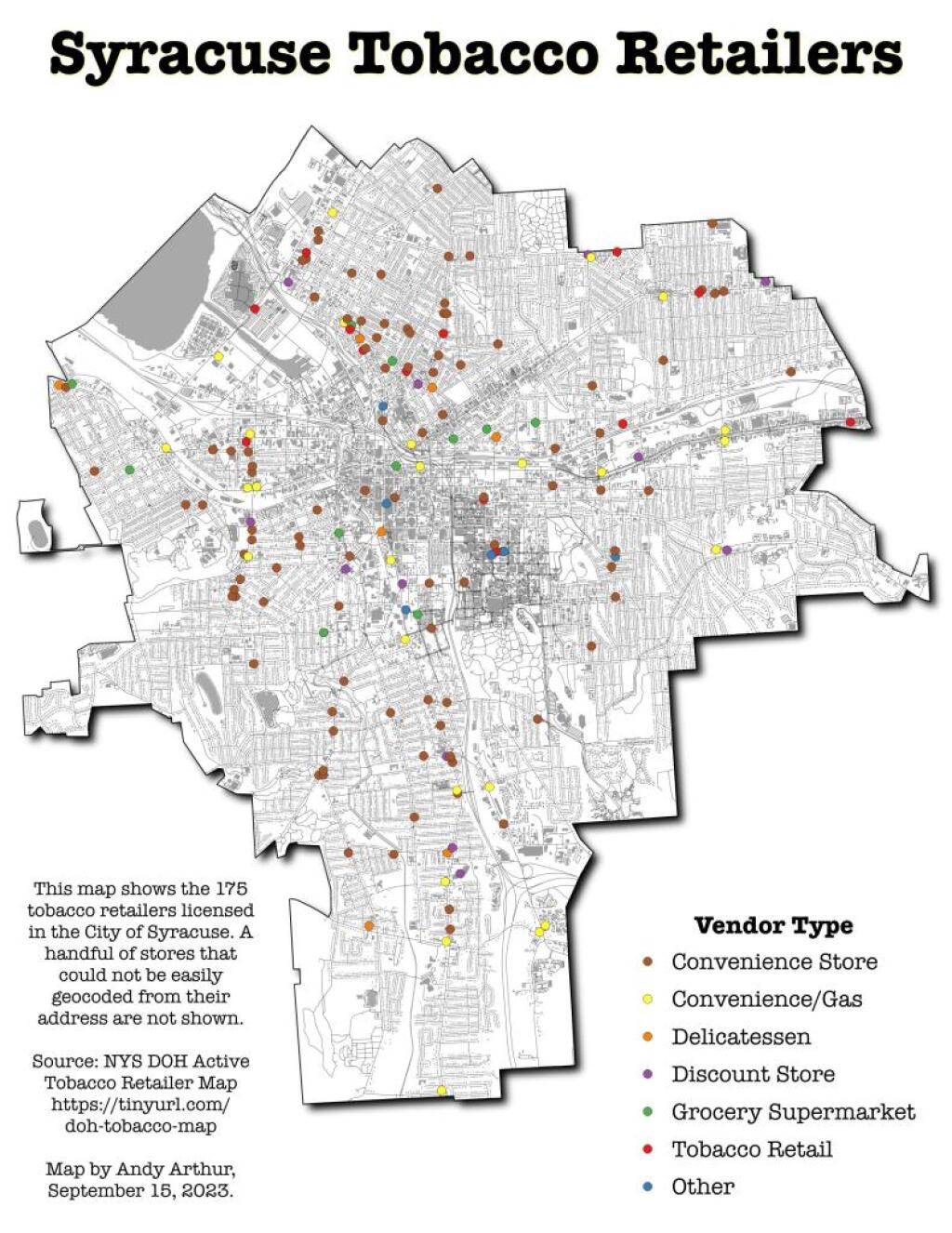 Download a High Resolution JPEG Image of the Syracuse Tobacco Retailers Map or an Adobe Acrobat Printable PDF of the Thematic Syracuse Tobacco Retailers Map.